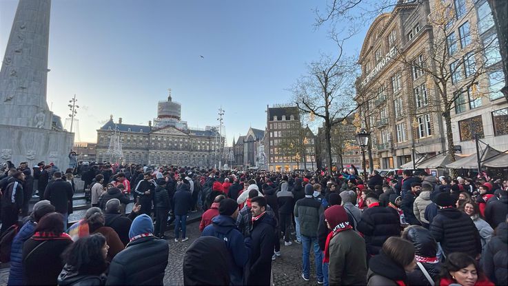 Os adeptos de Benfica e Ajax confraternizam numa das principais praças de Amesterdão