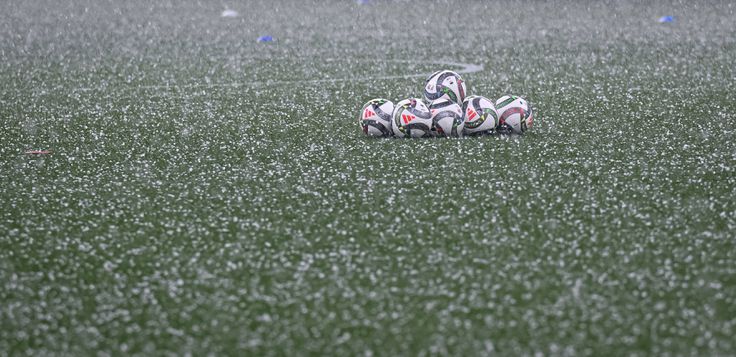 Neste momento as condições climatéricas são particularmente desfavoráveis. Os guarda-redes já haviam entrado para aquecimento mas, entretanto, começou a chover granizo de forma muito intensa.
