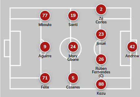 Jorge Aguirre sai do campo e é substituído por Cauê dos Santos numa substituição tática.