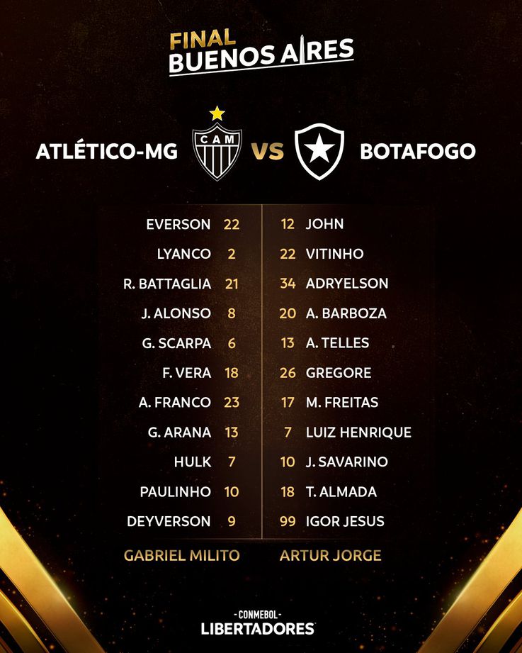 Boa noite! Seja muito bem-vindo(a) ao acompanhamento em direto à final da Taça Libertadores, que coloca frente-a-frente o Atlético Mineiro e o Botafogo, de Artur Jorge. Fique connosco que nós iremos trazer-lhe todas as incidências desta partida.