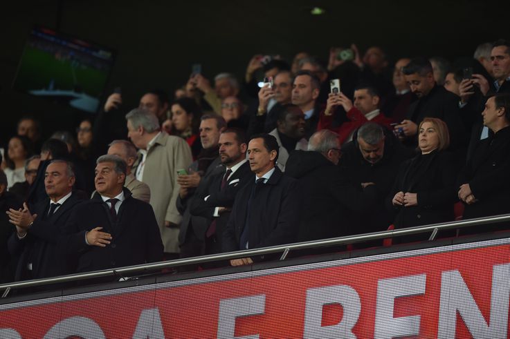 Novo presidente da Federação Portuguesa de Futebol, na Luz, perto dos presidentes de Benfica e Barcelona, Rui Costa e Joan Laporta, respetivamente.