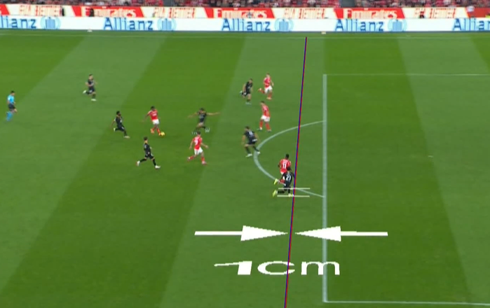 Tiago Manso neutraliza Schjelderup, fechando dentro e anulando ângulo de remate em jeito com o pé direito, característico do norueguês
