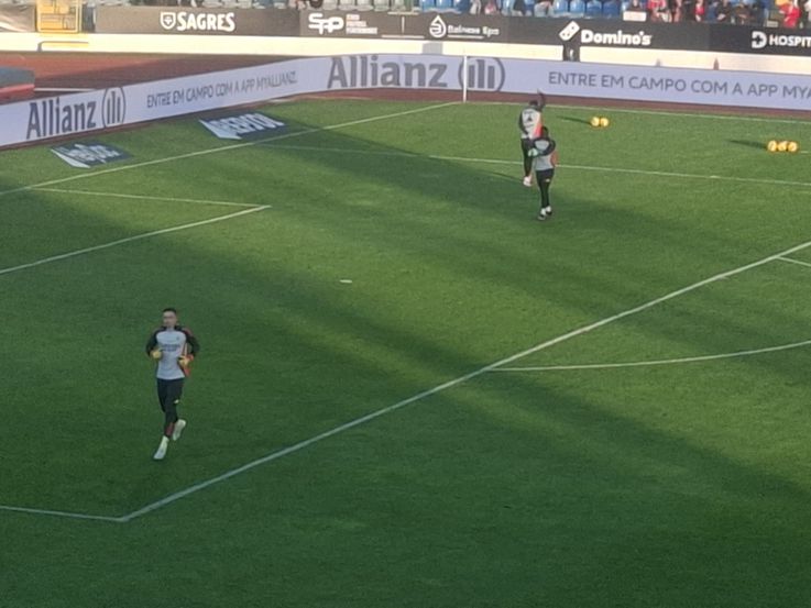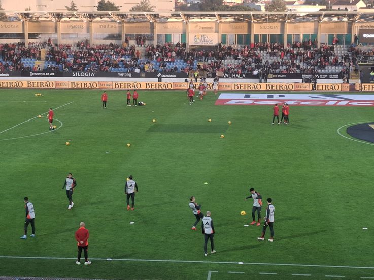 Os titulares e os suplentes do Benfica também já estão a aquecer no relvado do Estádio Municipal de Rio Maior: