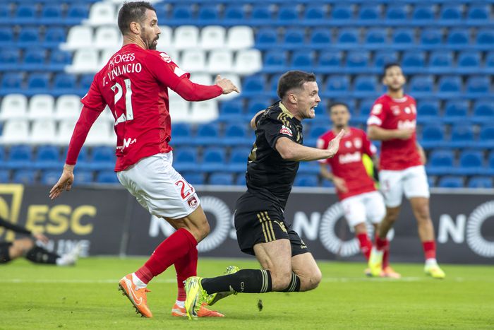 Sidney Lima tenta proteger a bola para ganhar pontapé de baliza, mas João Marques consegue desviar a bola contra o central adversário e ganhar canto para o Casa Pia.