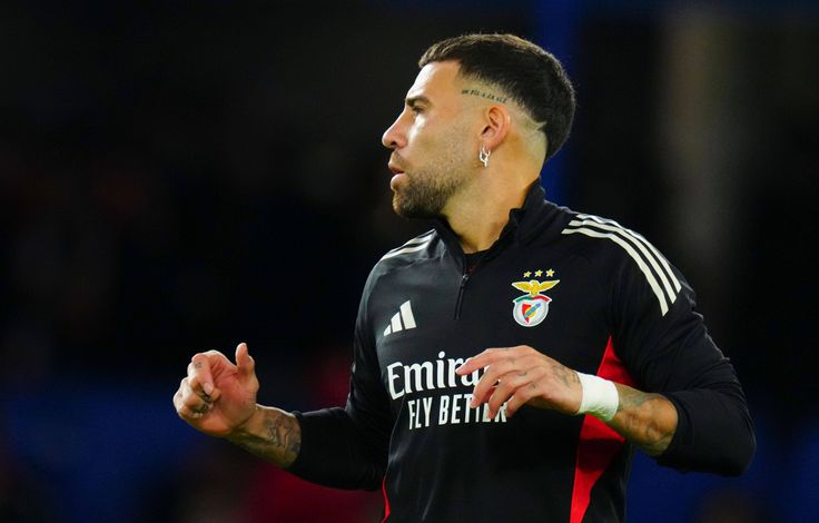O árbitro não aceita as queixas de Nicolás Otamendi e mostra-lhe o cartão amarelo