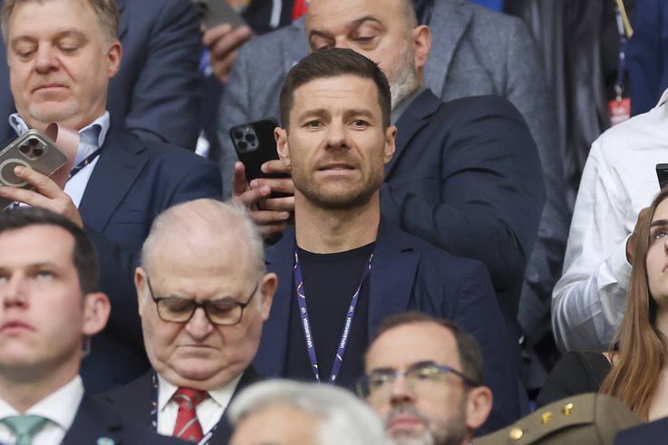 Xabi Alonso, treinador do Bayer Leverkusen, está nas bancadas a assistir ao jogo.