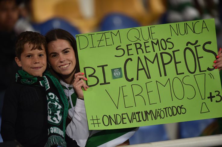 Grande apoio dos sportinguistas na Amoreira, com muitos aplausos para Rúben Amorim! Nas bancadas, uma adepta carrega um cartaz com a mensagem «Dizem que nunca seremos bi-campeões. Veremos! Onde vai um vão todos.»