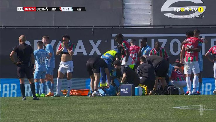 É enorme a consternação de companheiros de equipa e adversários ao se aperceberem da gravidade de lesão do jogador do Estrela, que sai agora de maca.