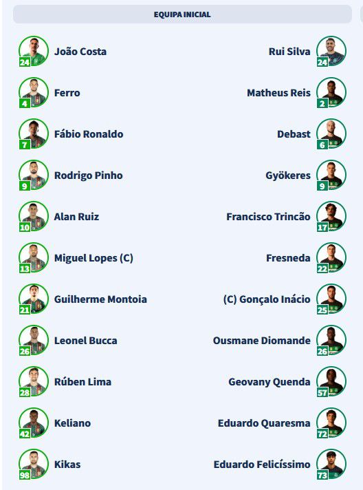 Recorde-se que do lado do Sporting são três as alterações operadas por Rui Borges em relação ao último onze: Maxi Araújo, Hjulmand e Morita são rendidos por Eduardo Quaresma, Gonçalo Inácio e Eduardo Felicíssimo.