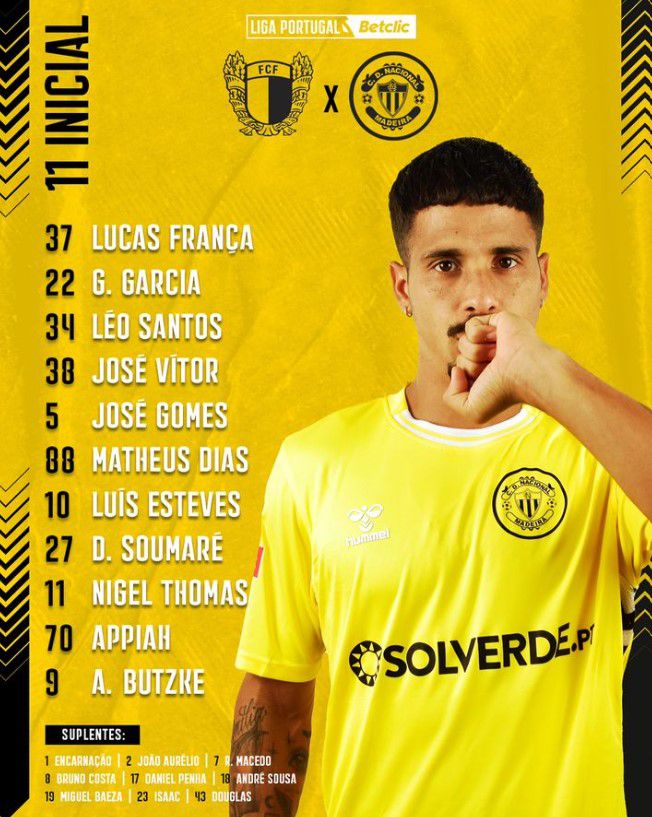 Já do lado dos madeirense, o treinador Tiago Margarido promove, esta tarde, três alterações. A saber: Tiago Reis, Miguel Baeza e Daniel Penha saem do onze para entrarem Thomas, Adrian Butzke e Soumaré.