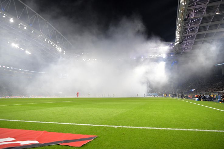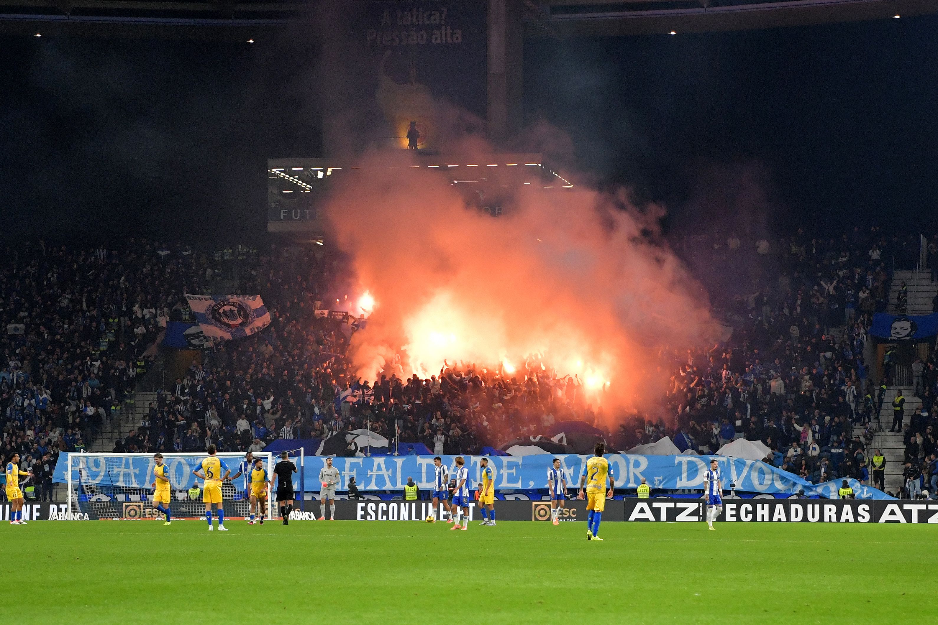 O árbitro da partida faz um compasso de espera, enquanto o fumo lançado pela claque azul e branca é ainda bem visível.