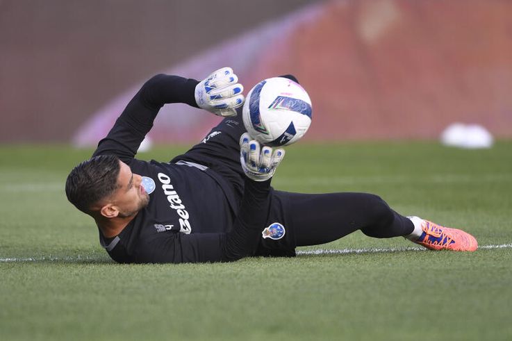 Os guarda-redes do FC Porto, Diogo Costa, Cláudio Ramos e João Costa, aquecem no relvado.