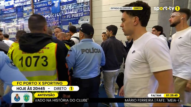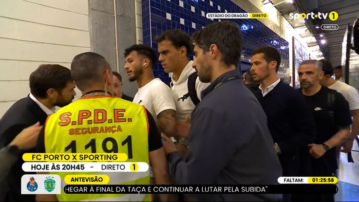 Momentos de confusão na chegada do Sporting à garagem do Estádio do Dragão. Entrada da comitiva leonina foi atrasada por alguns stewards que se encontravam na zona de acesso aos balneários e que impediram que os jogadores e staff dos leões avançassem de forma livre. Depois de alguns minutos de incerteza, a situação foi resolvida com a intervenção da PSP e o conjunto leonino foi entrando para a zona dos balneários.