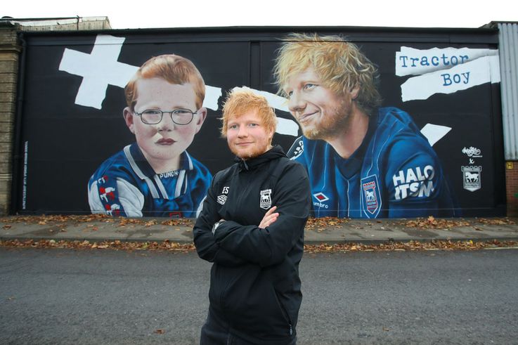 Ed Sheeran junto ao mural que lhe foi dedicado pelo Ipswich