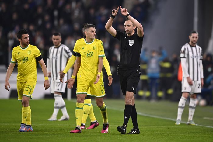 O árbitro não aceita as queixas de Carlo Pinsoglio e mostra-lhe o cartão amarelo