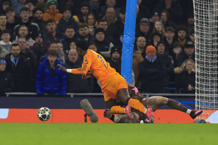Vinícius aparece isolado e é derrubado por Ederson na área. Real Madrid fica a pedir penálti, mas já estava assinalado fora de jogo ao internacional brasileiro.