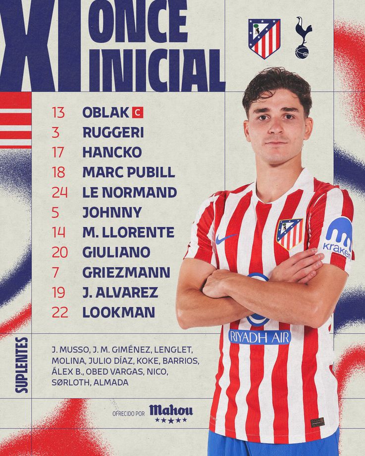 Atlético Madrid: Jan Oblak (C); Marc Pubill, Robin Le Norman, David Hancko e Ruggeri; Simeone, Marcos Llorente, Cardoso e Ademola Lookman; Antoine Griezmann e Julián Álvarez.