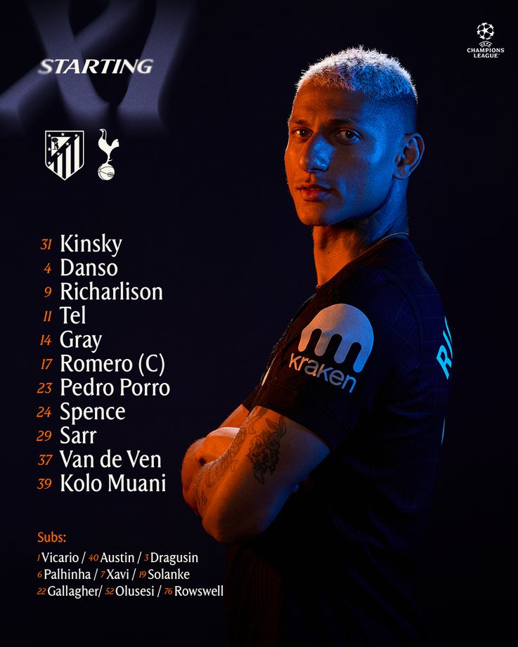 Tottenham: Antonín Kinsky; Van de Ven, Cristian Romero (C) e Kevin Danso; Pedro Porro, Pape Matar Sarr, Archie Gray e Djed Spence; Kolo Muani, Richarlison e Mathys Tel.