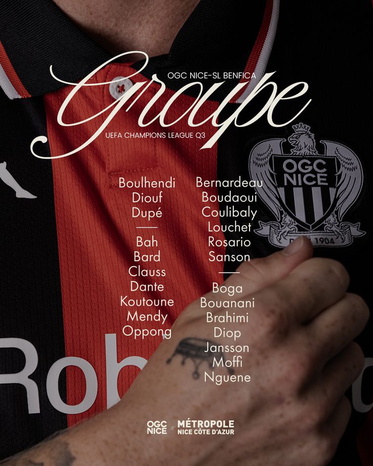 Suplentes do Nice: Maxime Dupé, Teddy Boulhendi, Kojo Peprah Oppeng, Tom Louchet, Pablo Rosario, Djibril Coulibaly, Gabin Bernardeau, Issiaga Camara, Bernard Nguene, Sofiane Diop, Billal Brahimi e Jérémie Boga