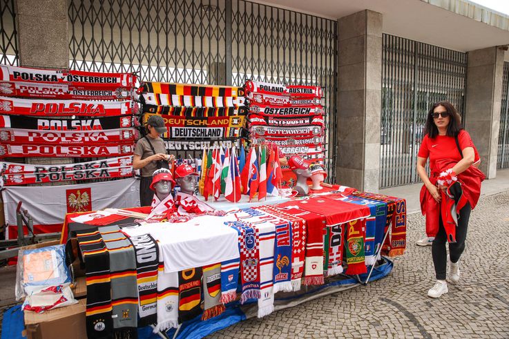 Lá por se tratar de um Polónia-Áustria, não quer dizer que não existam bancas que vendam cachecóis da Alemanha, Croácia, França e Portugal: