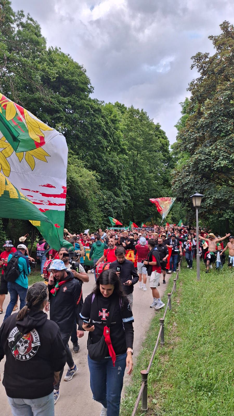 Festa portuguesa em Munique! Pepe, antigo internacional português, sabe o que é vencer a Liga das Nações e leva o troféu para o palco.