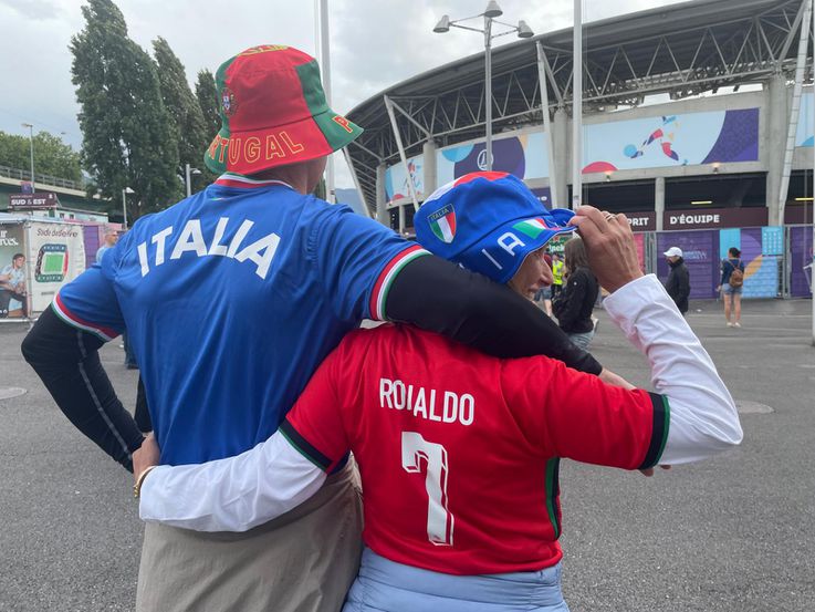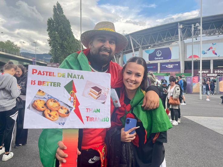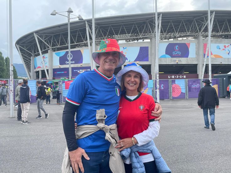 Entre marido e mulher, não se mete... futebol. Ou então mete. Mas com um sorriso nos lábios, claro está! Pizzaia (marido) e Ana (esposa) não escondem as respetivas raízes e vão assistir ao Portugal-Itália devidamente equipados. Durante os 90 minutos torcerão, naturalmente, cada um pelas suas cores, mas depois... prevalecerá o amor. Mais um excelente apontamento de reportagem da jornalista Filipa Reis, enviada-especial de A BOLA à Suíça.