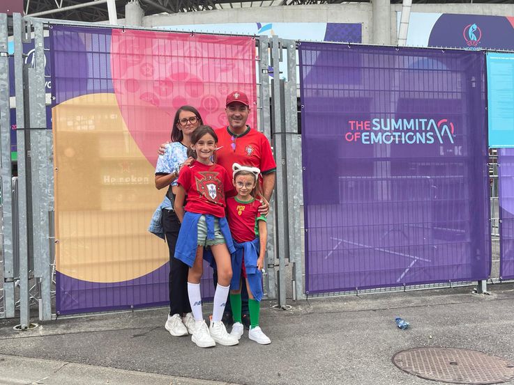 Não há como ter Portugal... na Suíça. Esta família lusa - Sónia e Crystophe com as respetivas filhas, Lyana (à esquerda) e Maelys (à direita) - também estará nas bancadas do anfiteatro helvético para assistir ao encontro das Navegadoras diante de Itália.