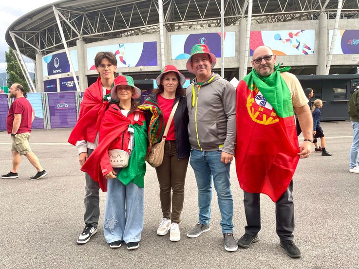 Com o aproximar da hora do jogo... cresce o apoio à Seleção Nacional. Através de mais esta foto da jornalista Filipa Reis, enviada-especial de A BOLA à Suíça, podemos ver que as cores portuguesas ganham cada vez mais expressão junto ao estádio onde vai decorrer o duelo com Itália. Neste caso, Fátima Borges e José Santos (ao meio) fazem-se acompanhar dos dois filhos, André da Silva e Joana da Silva (à esquerda), e do amigo Miguel Vieira (à direita).
