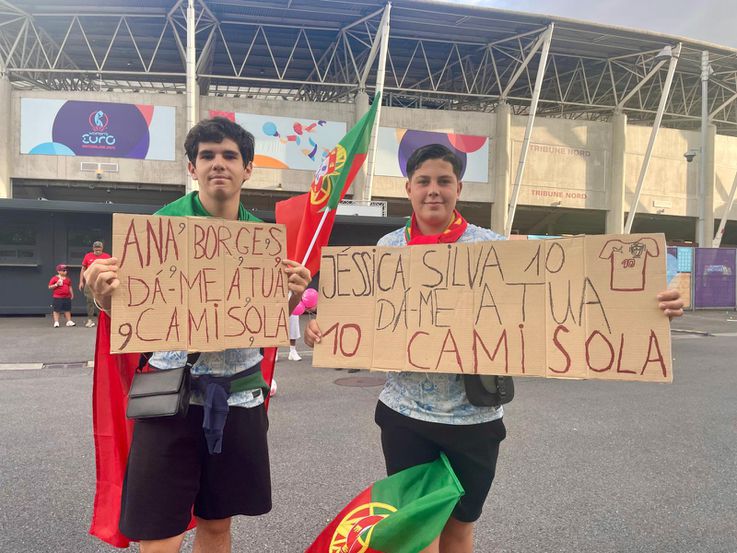 Ver um jogo da Seleção Nacional e tentar levar para casa uma (ou mais) camisola(s) das Navegadoras? É que o vão tentar Tomás Lopes e Tomás Pereira, que vivem na Suíça e que irão assistir ao vivo ao Portugal-Itália. Na lista de desejos, devidamente exposta nos cartazes que têm nas mãos, estão as preferências de ambos: Ana Borges e Jéssica Silva.