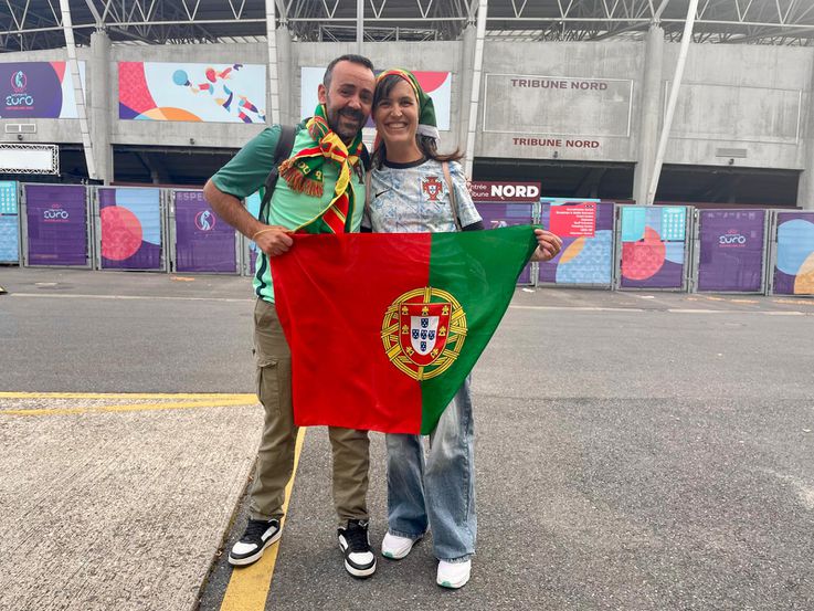 São cada vez mais os portugueses que vão chegando às imediações do Estádio de Genebra, como relatam as fotografias da jornalista Filipa Reis, enviada-especial de A BOLA à Suíça para a cobertura deste Campeonato da Europa. Neste caso, Bruno e Tânia Silveira, mais dois adeptos que irão torcer pelas Navegadoras.