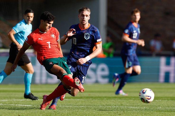 Primeira parte animada, que teve de tudo: uma expulsão, um penálti desperdiçado e muita emoção. Portugal teve oportunidade para inaugurar o marcador e ficou a jogar com mais um aos 21', depois da expulsão de Van Bommel. Aos 31', Quenda acertou no poste e falhou uma grande penalidade. Nos últimos minutos, os Países Baixos mostraram que podem criar perigo mesmo com 10. Viram um golo ser-lhes anulado e, pouco depois, Samuel Soares fez uma enorme defesa.