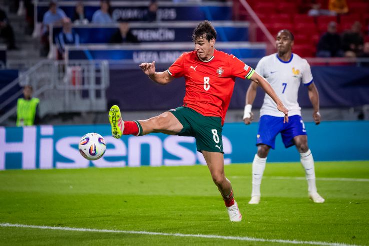 É GOLO DE PORTUGAL!!! MARCA HENRIQUE ARAÚJO!!! Roger Fernandes soltou em Geovany Quenda, que não conseguiu explorar a velocidade, mas nem por isso deixou de ser decisivo: esperou, analisou e, quando Henrique Araújo apareceu na desmarcação, isolou o avançado do Benfica, que, com toda a frieza, não vacilou!