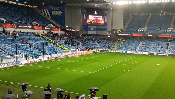 A equipa do Benfica já chegou ao relvado, mas em vez de dar a habitual volta de reconhecimento prefere, para já, ficar resguardado da chuva, debaixo do túnel de acesso ao tapete verde do Ibrox