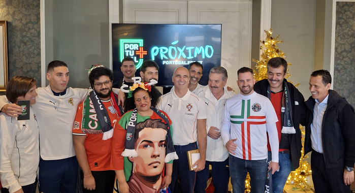 Na bancada portuguesa, que fica no topo norte, há um grande pano com as imagens, a preto e branco, de Diogo Jota e de André Silva. Há ainda outro pano mais comprido, com o nome do antigo internacional português.