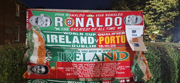 Irlandês a vender cachecóis de Cristiano Ronaldo e de Diogo Jota. «Do Ronaldo já só tenho quatro, do Jota só três», diz. E a maioria dos clientes são irlandeses.