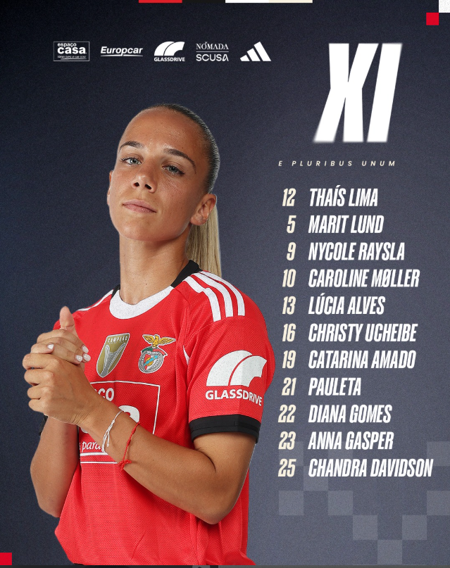 Suplentes Benfica: Rute Costa, Salomé Pratt, Beatriz Cameirão, Martín-Prieto, Letícia Almeida, Carole Costa, Lara Martins, Ana Clara Oliveira e Carolina Tristão.
