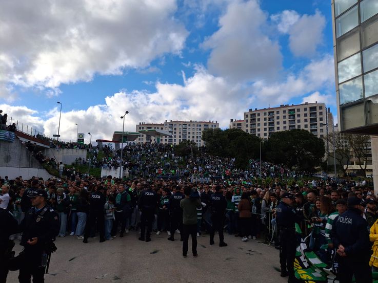 Uma enorme moldura humana a aguardar a equipa leonina. Espera-se uma chegada apoteótica, com Alvalade pintado de verde e branco, com muitas mensagens de apoio à equipa de Rui Borges.