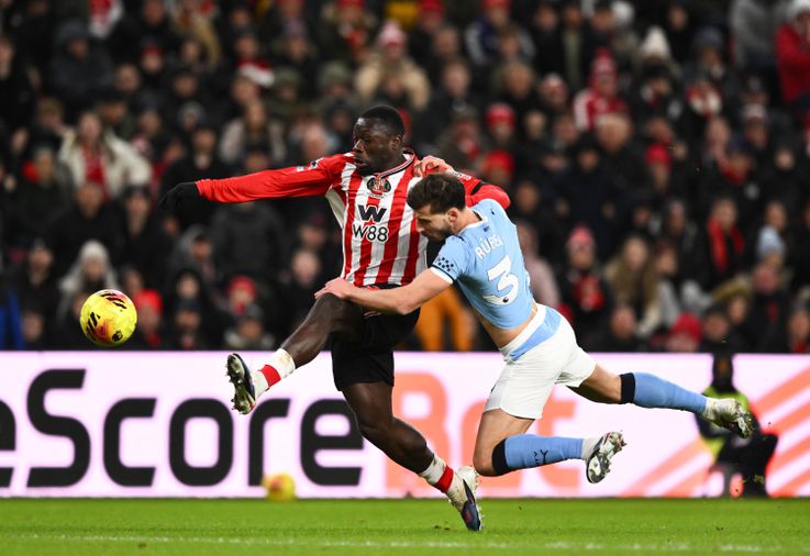 Quase golo do Sunderland! Mukiele lança Brobbey no ataque, o avançado ganha o duelo com Rúben Dias, deixando-o no chão, mas Donnarumma defende o seu remate e o português impede a recarga!