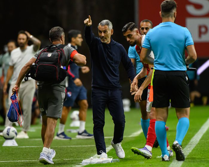 O jogo está parado, enquanto o árbitro fala com alguns jogadores.