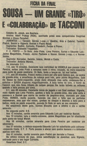 A 16 de maio de 1984, em Basileia, o golo de Sousa, aos 29’, na final da Taça das Taças perdida para a Juventus (1-2). Um ano depois, a 12 de maio de 1985, perante o Belenenses, nas Antas, o FC Porto ganha por 5-1e sagra-se campeão nacional, pela primeira vez com Pinto da Costa a presidente. Os golos são de Gomes (23’, 28’ e 78’), Jaime Magalhães (74’) e Futre (87’).