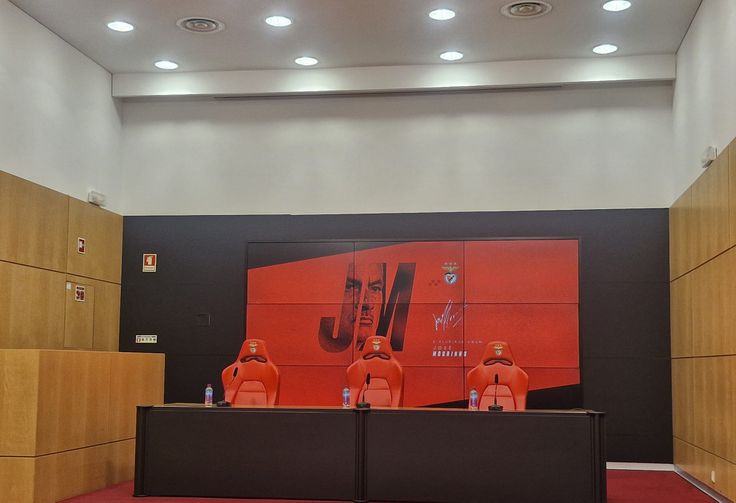 O ecrã da sala de imprensa do Benfica Campus já alude ao novo treinador encarnado, mas as cadeiras à sua frente ainda estão vazias