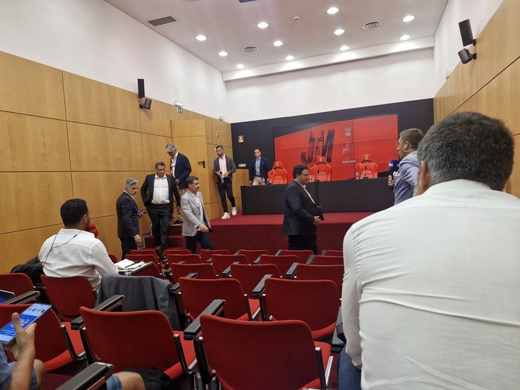 O grupo de oito elementos da estrutura encarnada presentes na sala de imprensa inclui Nuno Catarino, CFO e vice-presidente do Conselho de Administração da SAD, Nuno Costa, chefe do gabinete de Rui Costa, Mário Branco, diretor-geral do futebol e Simão Sabrosa, diretor-técnico e Joaquim Milheiro, coordenador da formação