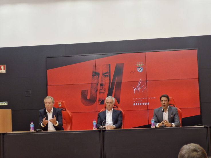 15 jornalistas, 14 repórteres de imagem e sete fotógrafos estão presentes na sala de imprensa do Benfica Campus. Os números refletem a dimensão do regresso de José Mourinho ao comando técnico de um clube luso, 21 anos depois de ter abandonado o FC Porto.