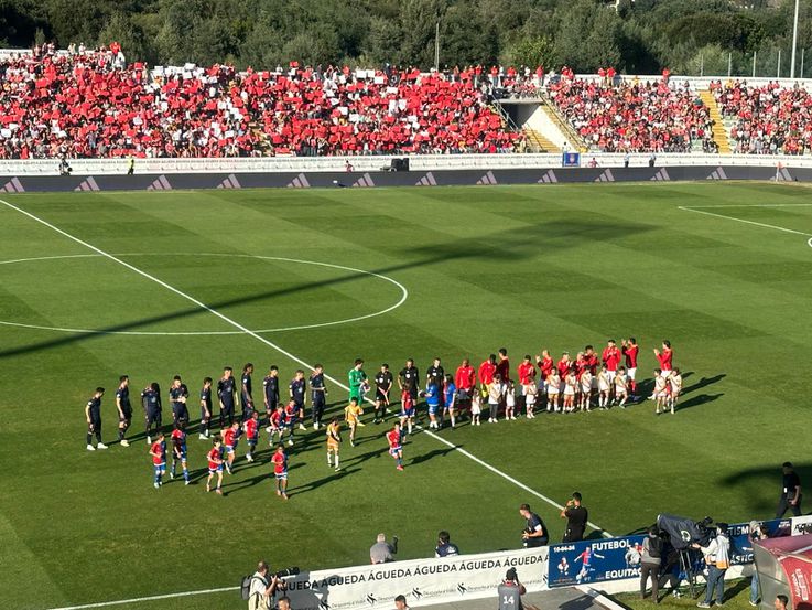 Guarda-redes de ambas as equipas já aquecem no relvado do Estádio Municipal de Águeda.