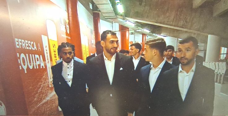 Plantel sénior do futebol do Benfica acaba de chegar. Mário Branco, diretor-geral, lidera o pelotão.