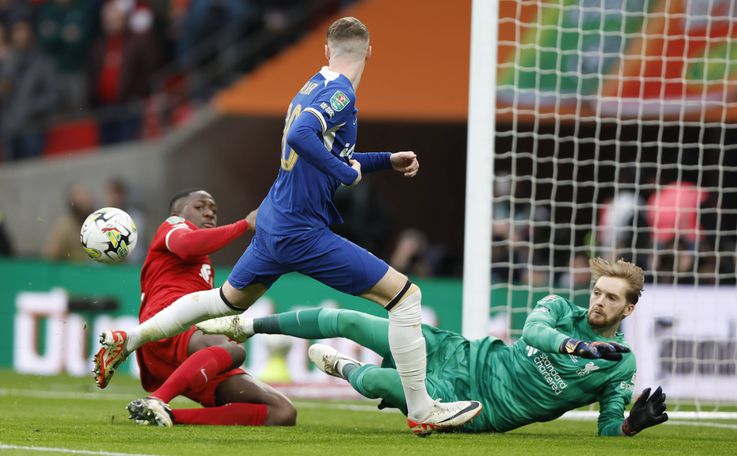111' Madueke remata à entrada da área, a bola ainda desvia num defesa do Liverpool e acaba nas mãos de Kelleher.