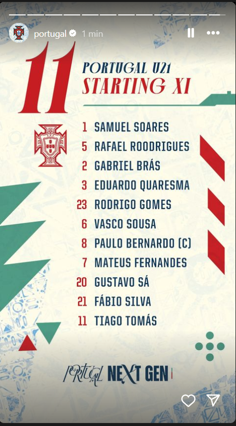 70'- Primeiras trocas de Portugal. Entradas de Rodrigo Mora, em estreia neste escalão, e Bernardo Folha, para o lugar de Mateus Fernandes e Tiago Tomás