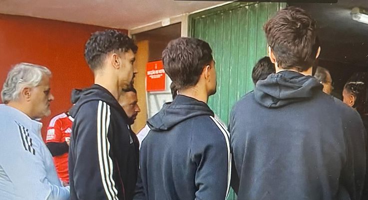 10h45: Equipa está na Casa do Benfica do Seixal para votar, com José Mourinho e Simão Sabrosa, diretor técnico do futebol profissional. Trubin e Otamendi foram os primeiros a votar. António Silva, Tomás Araújo e Henrique Araújo fecham a fila. Imagem: BTV