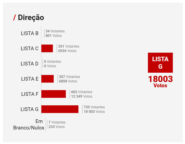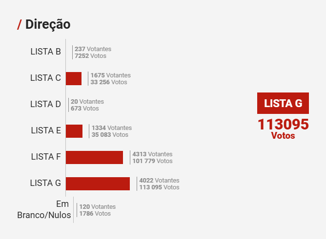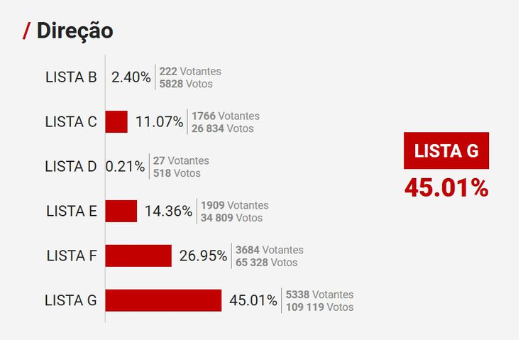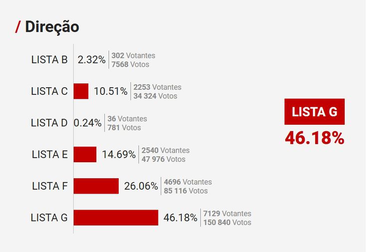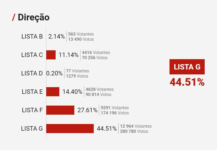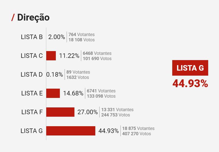 Eis os resultados finais, contabilizadas as 108 secções de voto. Rui Costa (Lista G) vence a primeira volta, mas sem maioria absoluta. Noronha Lopes (Lista F) segue para a segunda volta contra o presidente do Benfica.