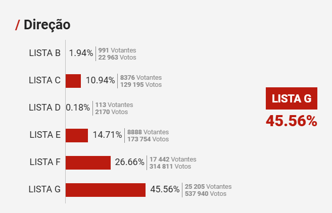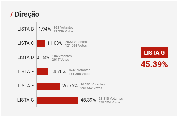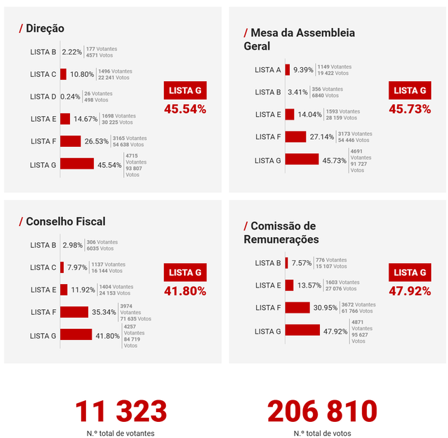8h03: De reforçar que, embora a contagem já tenha chegado a metade das secções de voto, ainda não chegou a metade dos votantes, pois faltam os locais com maior afluência: nesta altura temos resultados de 23.503 votantes, de um total de 85.422 sócios.